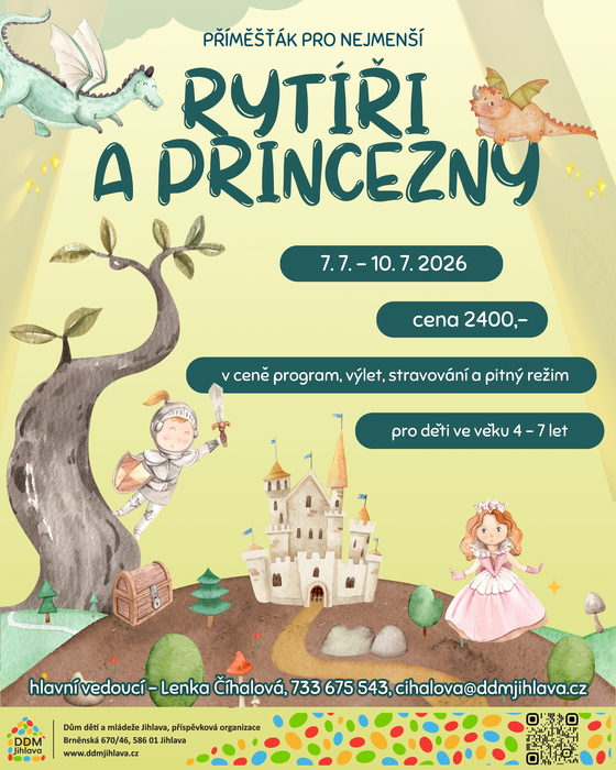 Vydej se s námi do pohádkového království plného rytířů a princezen! Malí rytíři i princezny si vyzkouší rytířské úkoly, královské hry, tvoření i pohádkové soutěže. Tábor je vhodný pro kluky i holky a klade důraz na radost z pohybu, kamarádství a objevování. Každý den přinese nový příběh a nezapomenutelné zážitky v bezpečném a přátelském prostředí.